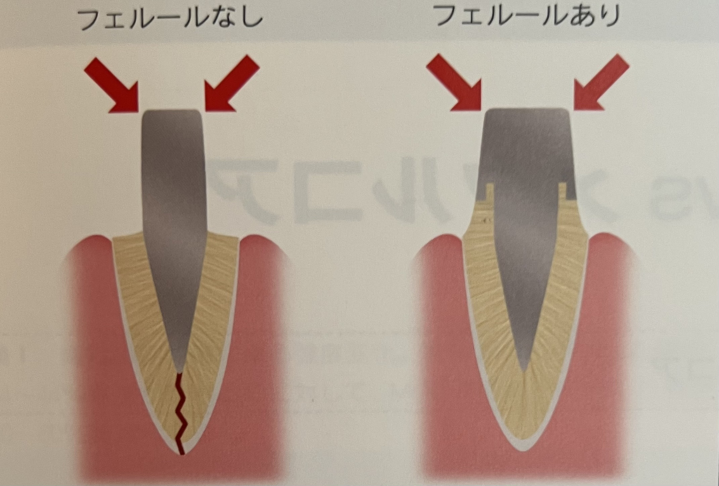 もちろんフェルールがない状態でもなんとか土台を立てて残す治療が絶対悪とは思いませんが、しっかり患者さんに現状とリスク、そして治療の選択肢を提示しその結果そういったリスクも承知の上での処置なのか、そうでないのかというところは全然意味合いが違うと思います。